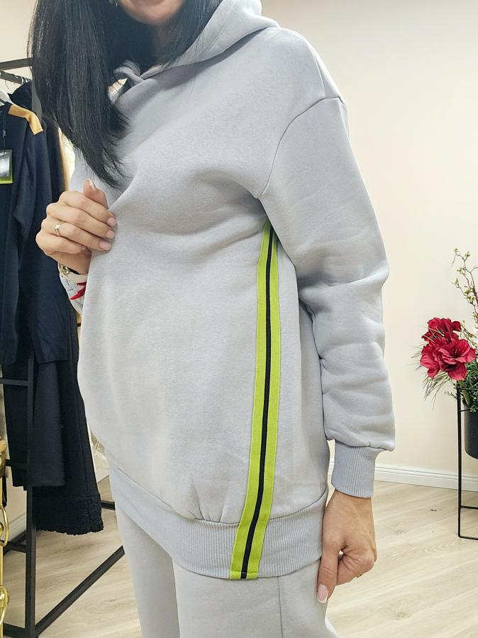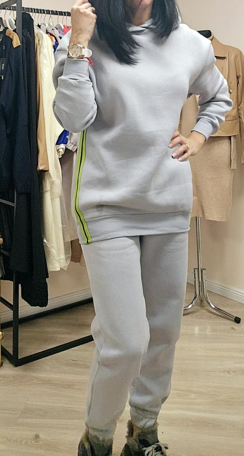 Тёплый на флисе костюм с капюшоном. Байка удлинённая без карманов. В Штанах есть карманы.